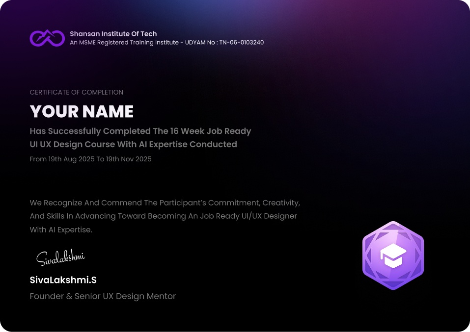 Yes. You will receive an MSME-certified course completion certificate that validates your training in UI/UX Design. The certificate also highlights your skills in AI-integrated design, adding value to your professional profile.